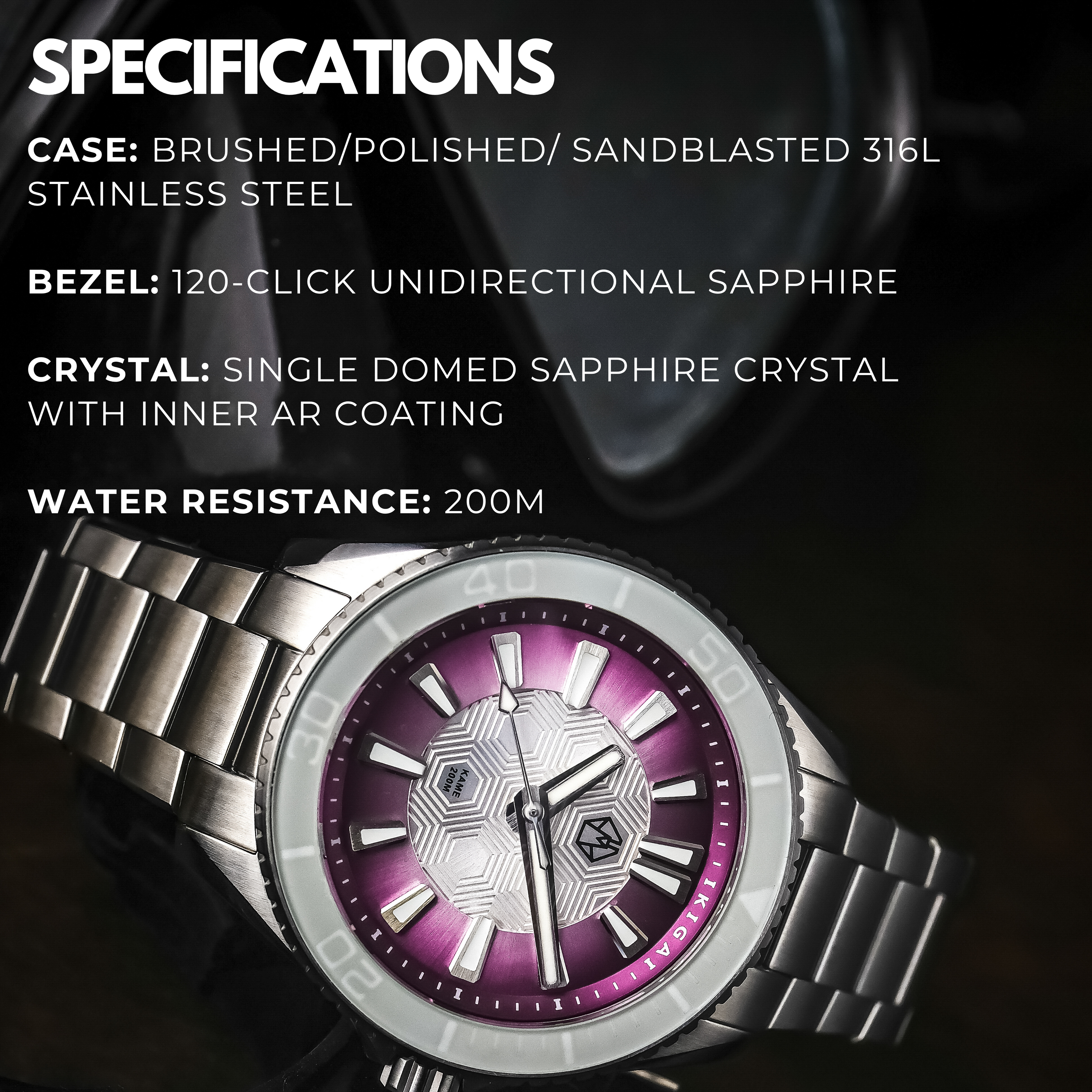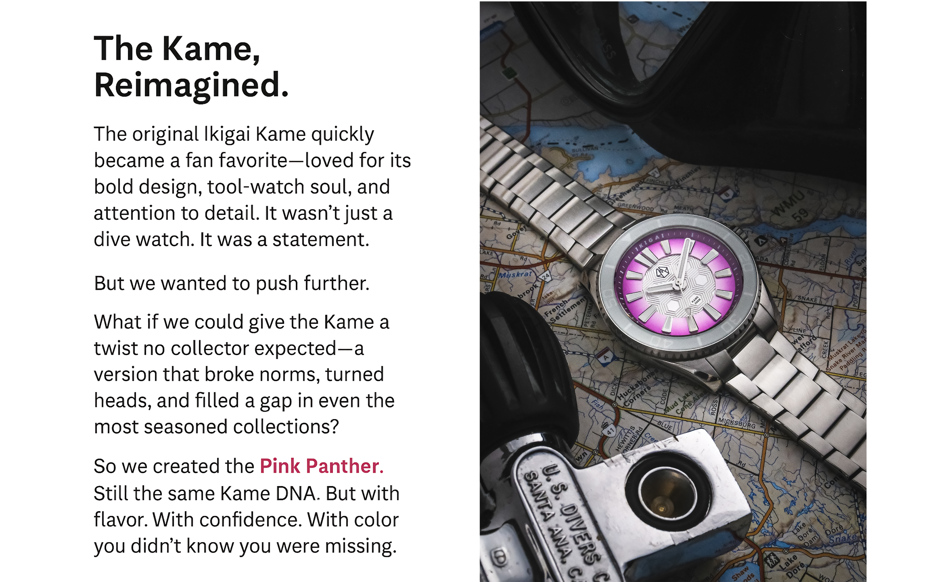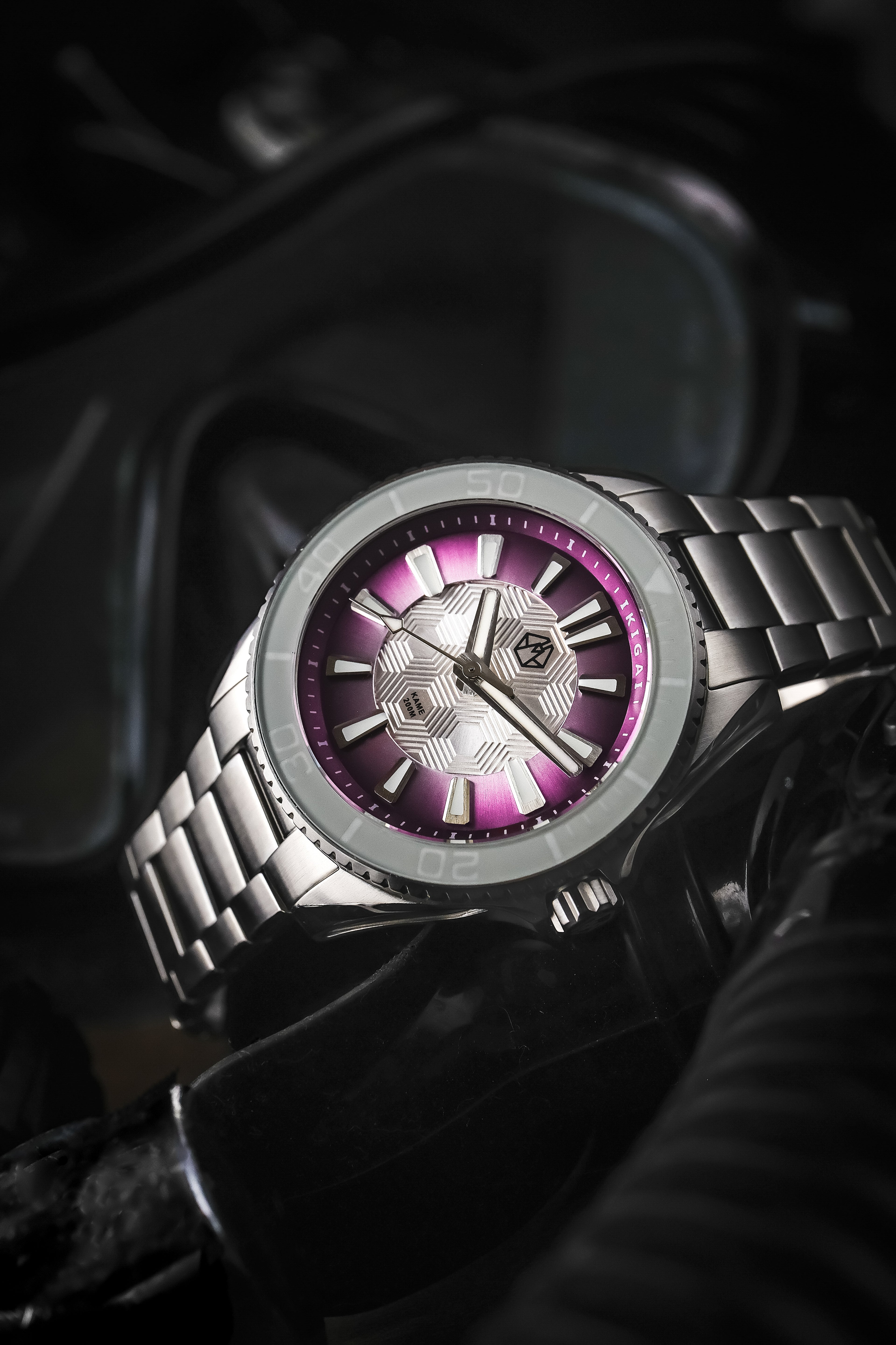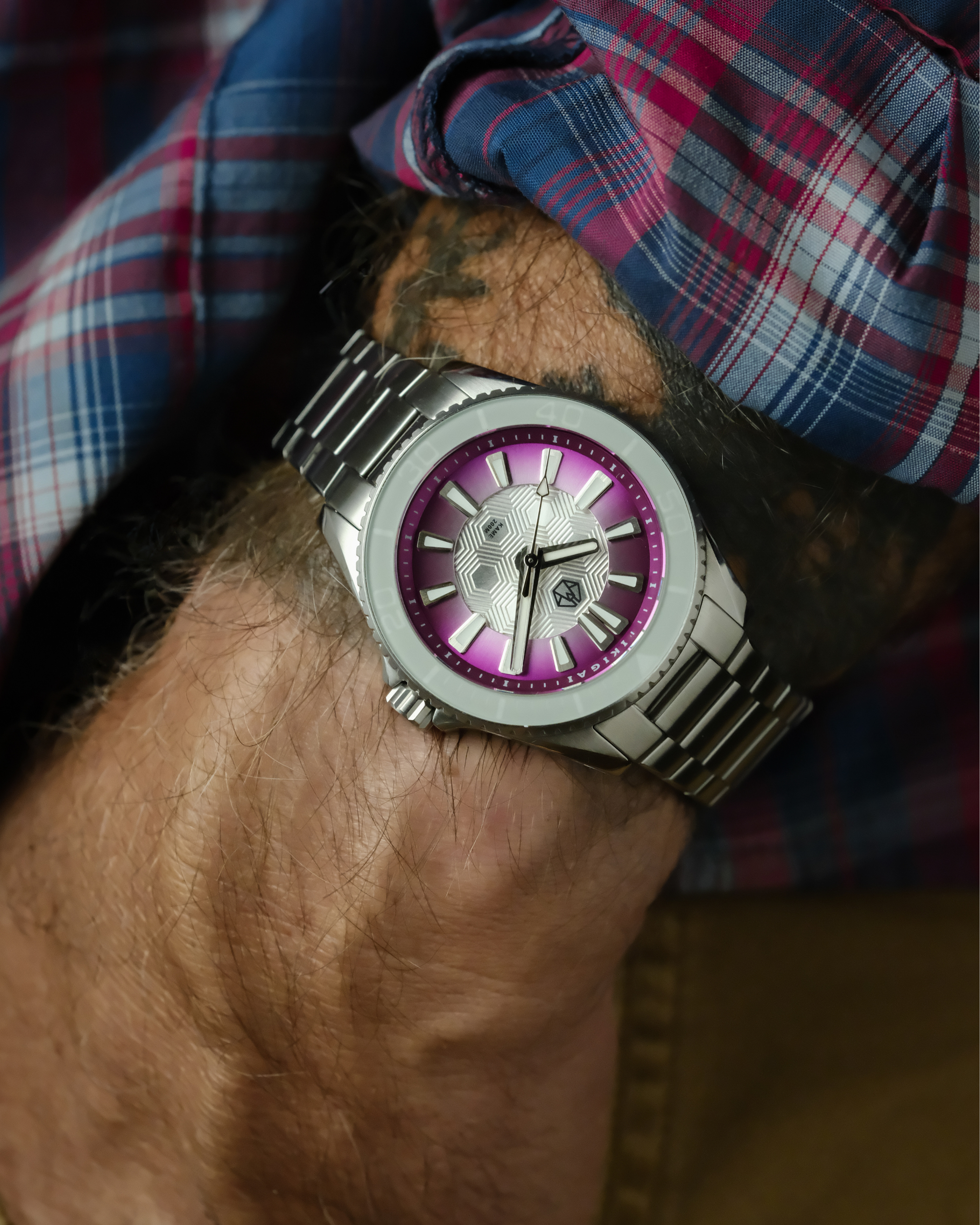 The Pink Panther brings a bold splash of personality to your collection — a colorway you likely haven’t seen before. At its heart, a crisp white dial with a subtle metallic sheen catches the light with elegance. As your eye travels outward, the dial seamlessly fades into a radiant, metallic purple-pink gradient — striking, playful, yet sophisticated. It's a color built for collectors who want something daring and different. Fun, but never unserious.