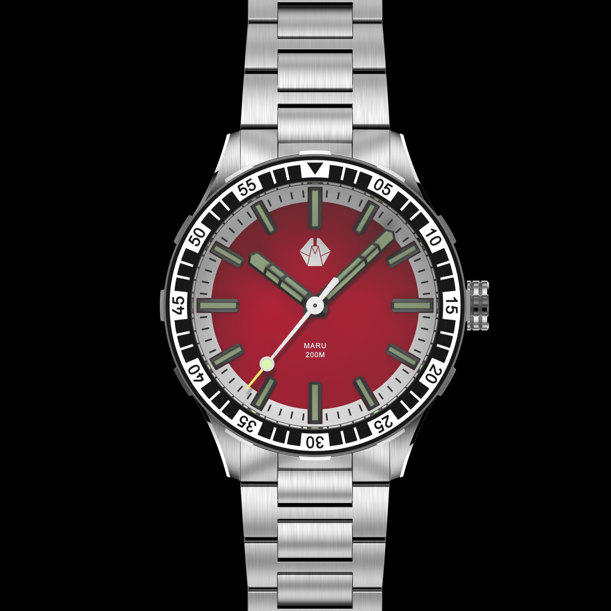 An elegant rendition of the Maru boasting a dial reminiscent of wine hues. Showcasing a sophisticated matte Burgundy Red dial paired with a black stainless steel bezel, this combination is flawlessly suited for formal occasions and refined attire.